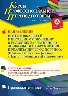 Подготовка детей к школьному обучению в условиях вариативного дошкольного образования и реализации ФГОС ДО и НОО. Присваивается квалификация Педагог предшкольной подготовки (252 ч.)
